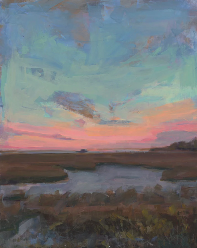 Marsh Light invites you into the golden hush of the Lowcountry marsh — inspired by the view from the Pitt Street Bridge, where evenings glow with quiet activity like fishing, crabbing, and birding. Warm horizons blend with deep marsh blues and the silhouette of a dock house lying at the water’s edge